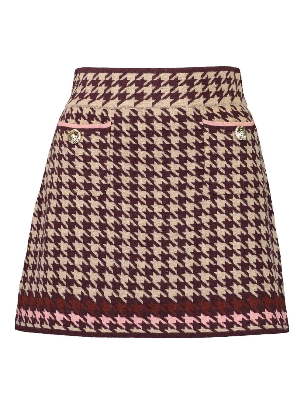 Lynne houndstooth pocket skirt Highlights - Maroon - Houndstooth pattern - High waist - Button embellishment - Two pockets - Hemline band Imported Composition Merino 55%, Cotton 45% Washing instructions Read Manufacturer Guidelines