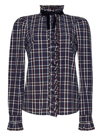 Pia tartan ruffled shirt Highlights - Navy blue - Tartan pattern - Ruffled front - Collar bow-detail - Ruffled cuffs - Long sleeves Imported Composition Cotton 100% Washing instructions Read Manufacturer Guidelines
