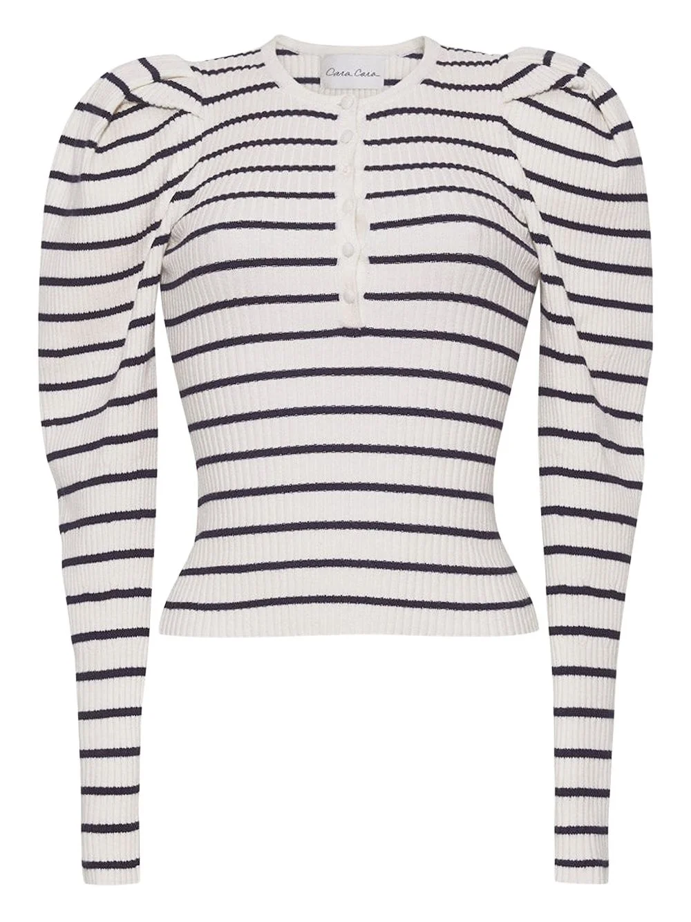 puff-sleeve striped top Highlights - White - Ribbed knit - Horizontal stripes - Puff sleeves - Button placket - Long sleeves Imported Composition Cotton 89%, Nylon 6%, Cashmere 4%, Spandex/Elastane 1% Washing instructions Read Manufacturer Guidelines