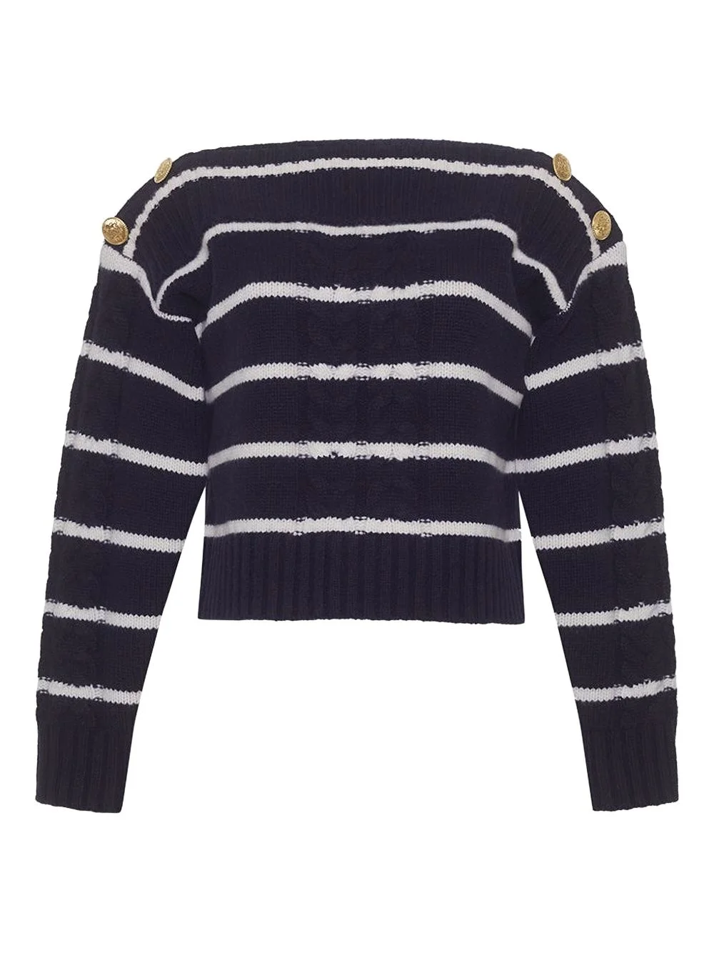 Sarita cable-knit striped sweater Highlights - Navy blue/white - Striped pattern - Cable knit - Boat neck - Gold-tone button embellishment - Long sleeves - Cropped - Ribbed trim - Merino wool Imported Composition Outer: Merino 100% Washing instructions Hand Wash