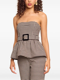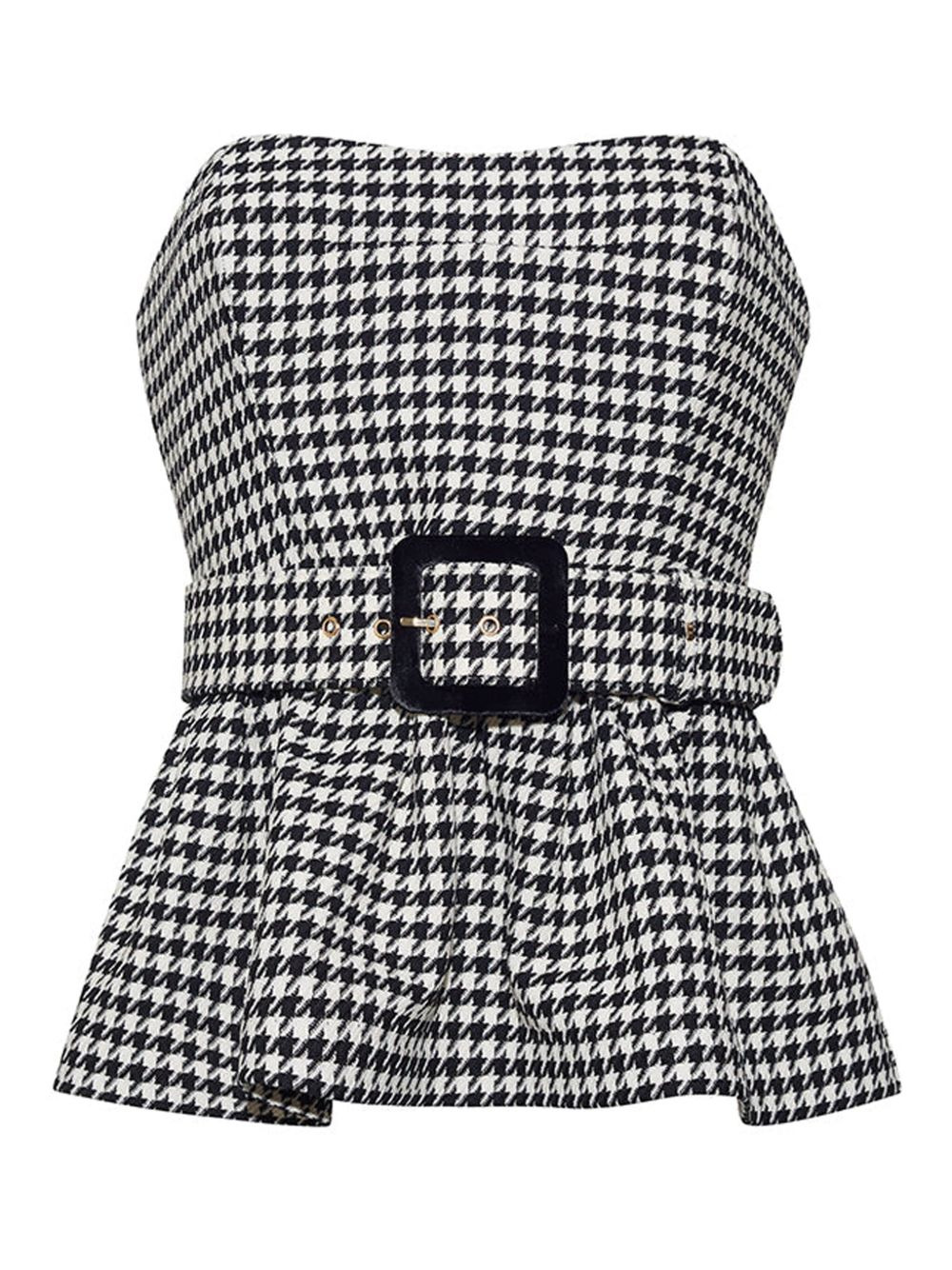 Tilda houndstooth peplum top Highlights - Black and white - Houndstooth pattern - Strapless neckline - Peplum hem - Belted waist Imported Composition Wool 85%, Polyester 15% Washing instructions Dry Clean Only