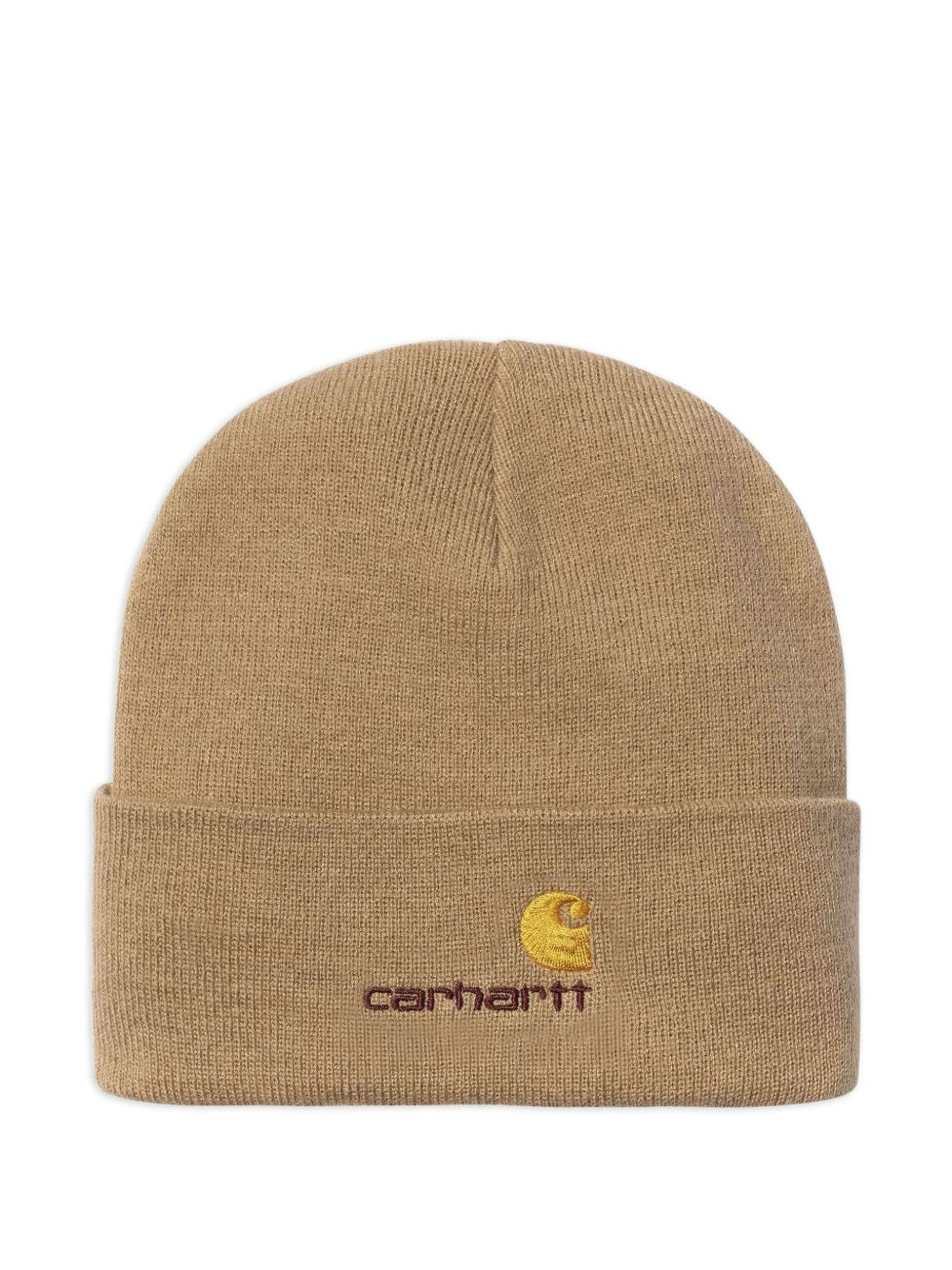 American Script embroidered-logo beanie hat Highlights - Beige - Stretch-knit style - Embroidered logo - Cuffed hem Imported Composition Recycled Polyester 100%