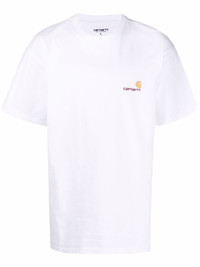 American Script short-sleeve T-shirt This Carhartt WIP American Script T-shirt follows the brand's durable style. It is crafted from soft cotton, in a white hue, and features a two-tone American Script logo embroidered on the chest. Made in United Kingdom Composition Cotton 100% SIZE & FIT Model measurements Height 6 ft 3 in(1.9 m) Bust/Chest 38.18 in(97 cm) Hips 37.79 in(96 cm) Waist 32.67 in(83 cm) Measurement CHEST 46.06 in(117 cm)