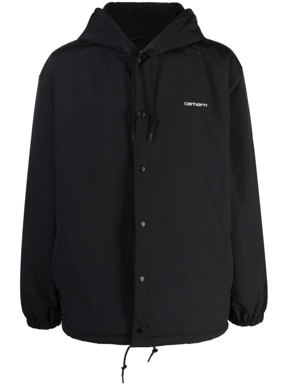 Coach logo-embroidered hooded jacket Highlights - Black - Embroidered logo at the chest - Drawstring hood - Front press-stud fastening - Long sleeves - Elasticated cuffs - Two side welt pockets - Drawstring hem - Fleece lining - Water-repellent Imported Composition Lining: Polyester 100% Outer: Nylon 100% Washing instructions Machine Wash