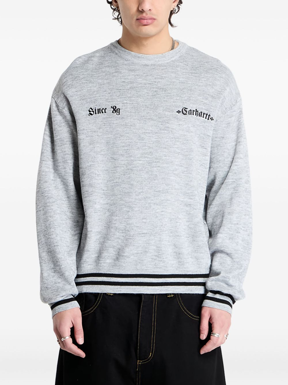 embroidered ribbed-cuff sweater Highlights - Grey - Embroidered detail - Ribbed cuffs - Crew neck - Back graphic Imported Composition Acrylic 75%, Wool 10%, Polyamide 10%, Viscose 5% Washing instructions Read Manufacturer Guidelines