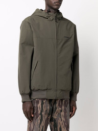hooded bomber jacket army green drawstring hood front zip fastening long raglan sleeves embroidered logo at the chest front zip fastening pockets ribbed hem Imported Composition Outer: Polyamide 100% Lining: Polyester 100%, Nylon 100% SIZE & FIT Model measurements Height 6 ft 2 in(1.87 m) Bust/Chest 36.41 in(92.5 cm) Hips 37 in(94 cm) Waist 29.52 in(75 cm) Washing instructions Machine Wash