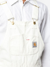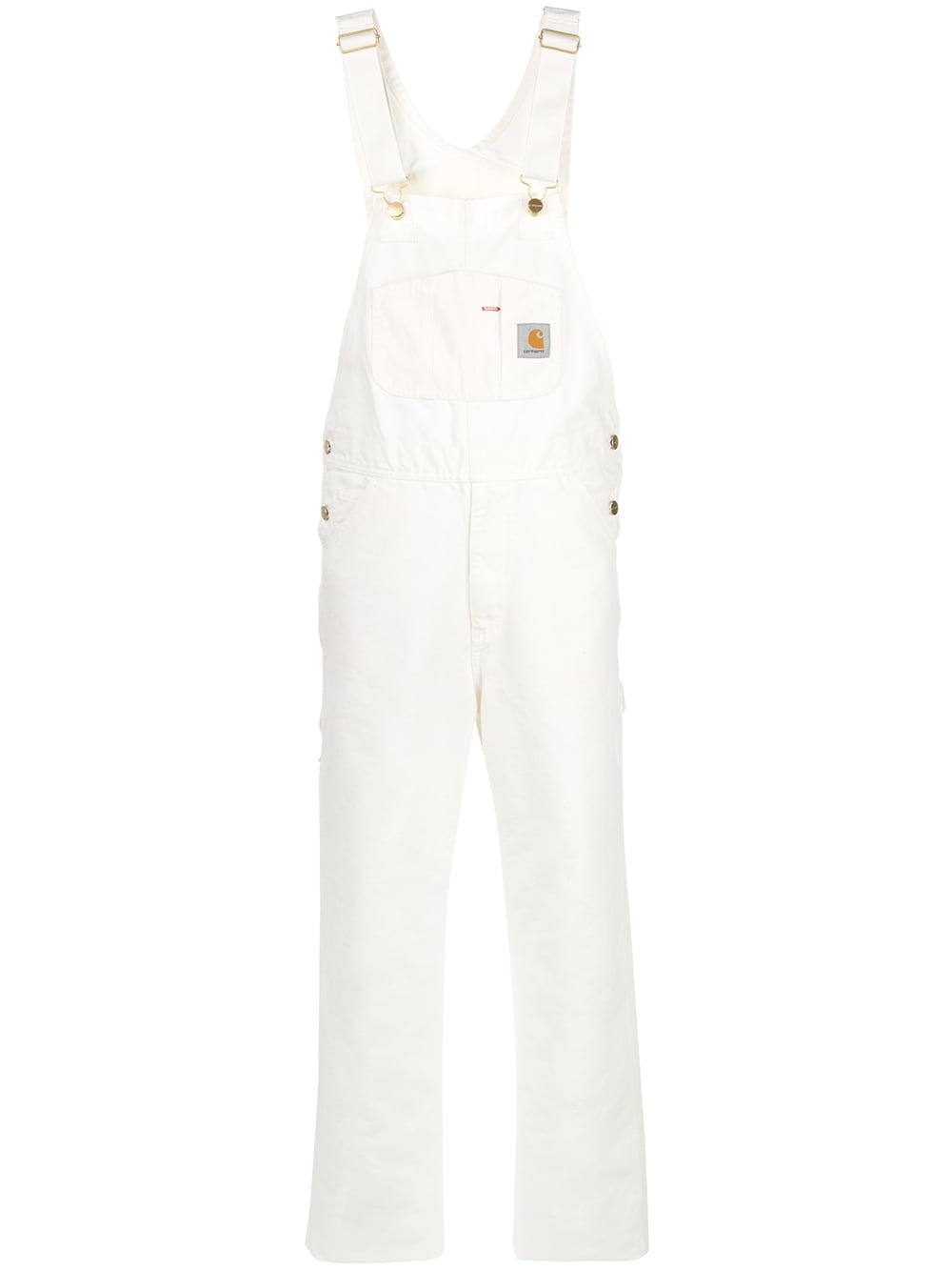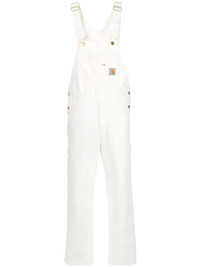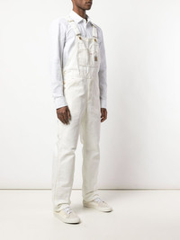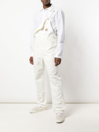 straight-leg denim overalls White cotton denim overalls from Carhartt WIP featuring adjustable shoulder straps, a front logo patch, a side button fastening, two back patch pockets, a relaxed fit and a straight leg. Imported Composition Cotton 100% Lining: Polyester 65%, Cotton 35% SIZE & FIT Model measurements Height 6 ft 1 in(1.85 m) Bust/Chest 39.76 in(101 cm) Hips 36.61 in(93 cm) Waist 27.95 in(71 cm) Washing instructions Machine Wash