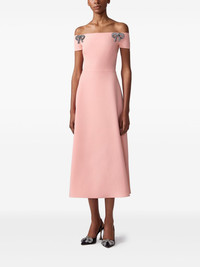 bow-applique midi dress Highlights - Peach pink - Concealed rear zip fastening - Off-shoulder - Short sleeves - Crystal embellishment Made in United States Composition Polyester 92%, Polyurethane 8% Washing instructions Dry Clean Only