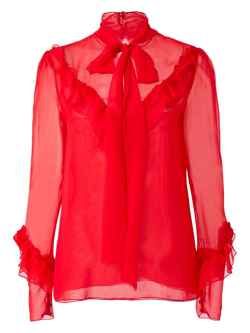 chiffon blouse Highlights - Scarlet - Single rear button fastening - Buttoned-cuff sleeves - Bow detailing - Ruffled detailing Made in United States Composition Silk 100% Washing instructions Dry Clean Only