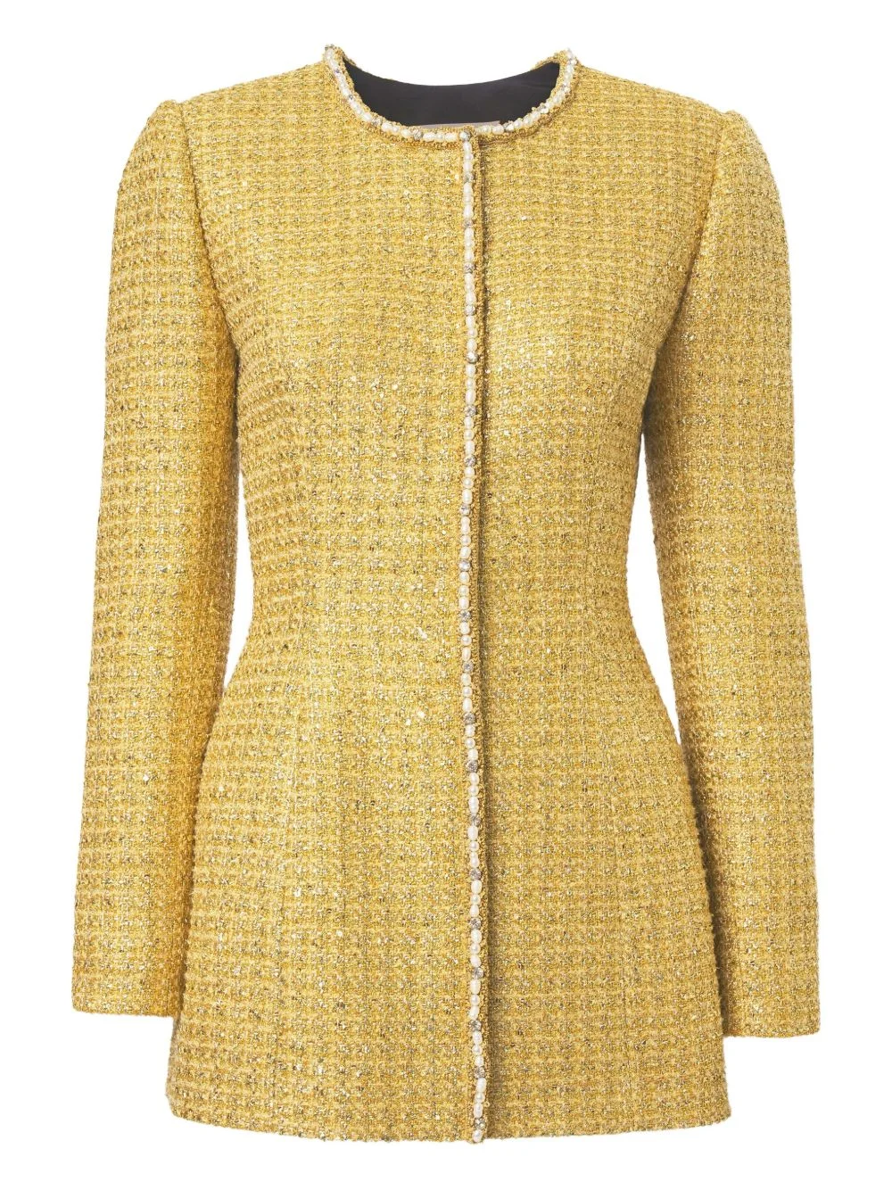 embellished tweed jacket Highlights - Gold - Lurex thread - Tweed effect - Round neck - Concealed press studs Imported Composition Nylon 35%, Metallized Polyester 27%, Polyester 20%, Virgin Wool 9%, Acrylic 9% Washing instructions Dry Clean Only