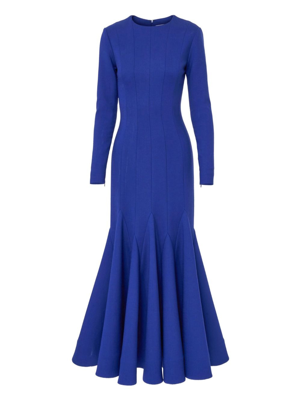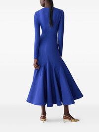 floral-applique wool dress Highlights - Dark blue - Godet detailing - Long sleeves - Fitted bodice - Flared skirt - Floral applique Made in United States Composition Virgin Wool 97%, Elastane 3% Washing instructions Dry Clean Only