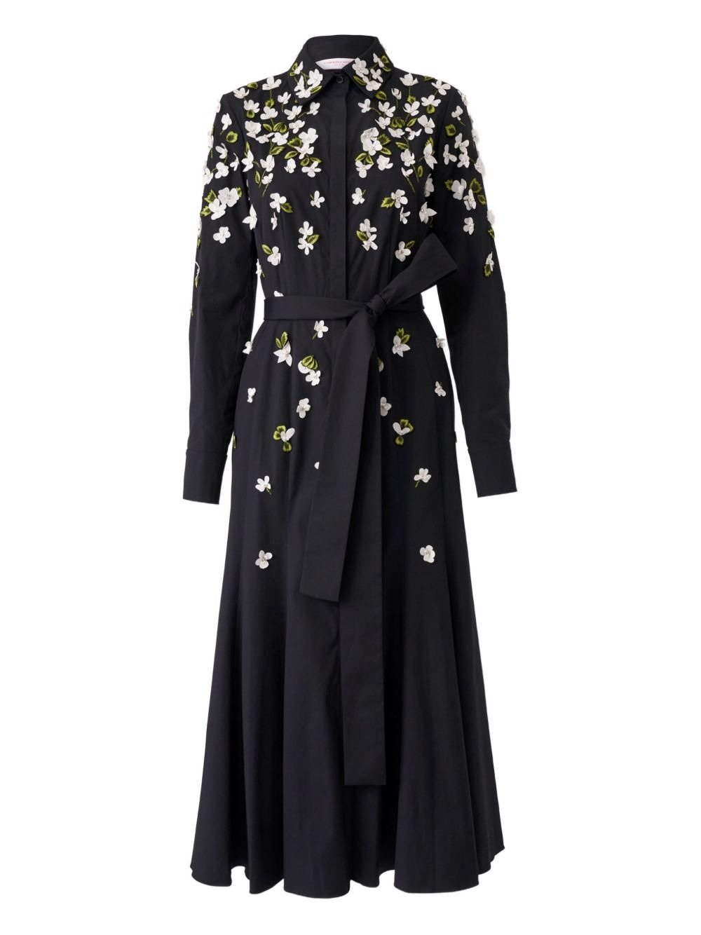 floral-embroidered midi dress Highlights - Black - Floral embroidery - Belted waist - Button fastening - Long sleeves - Classic collar Imported Composition Cotton 97%, Polyurethane 3% Washing instructions Dry Clean Only