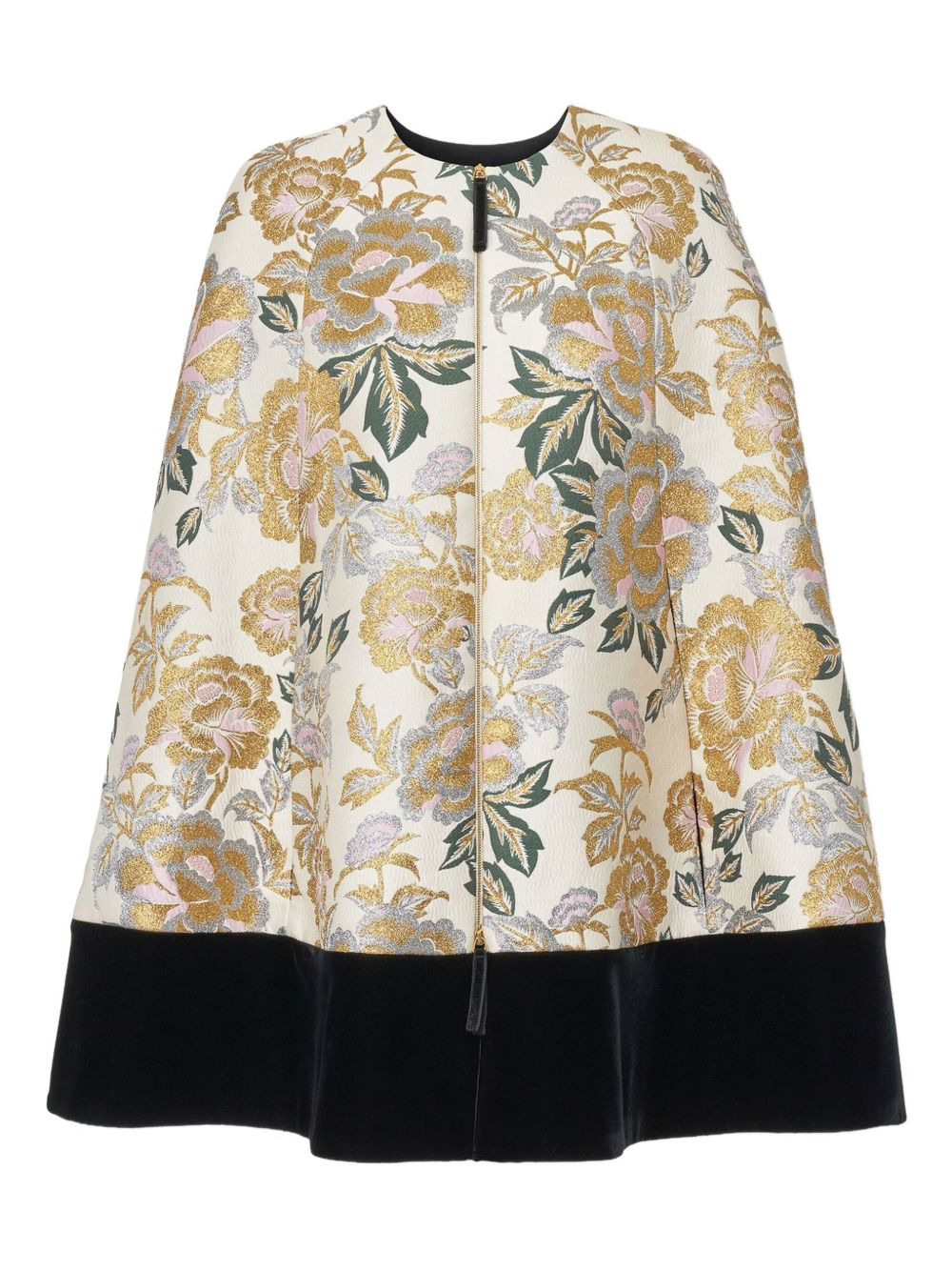 floral-jacquard velvet-trim cape Highlights - Ivory/multicolour - Floral jacquard - Velvet trim - Front zip fastening Made in United States Composition Polyester 79%, Metallized Polyester 11%, Nylon 10% Washing instructions Dry Clean Only