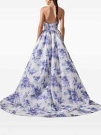 floral-print strapless gown Highlights - Blue - Rear zip fastening - Ruched bodice - Flared - Floral print Made in United States Composition Polyester 100%