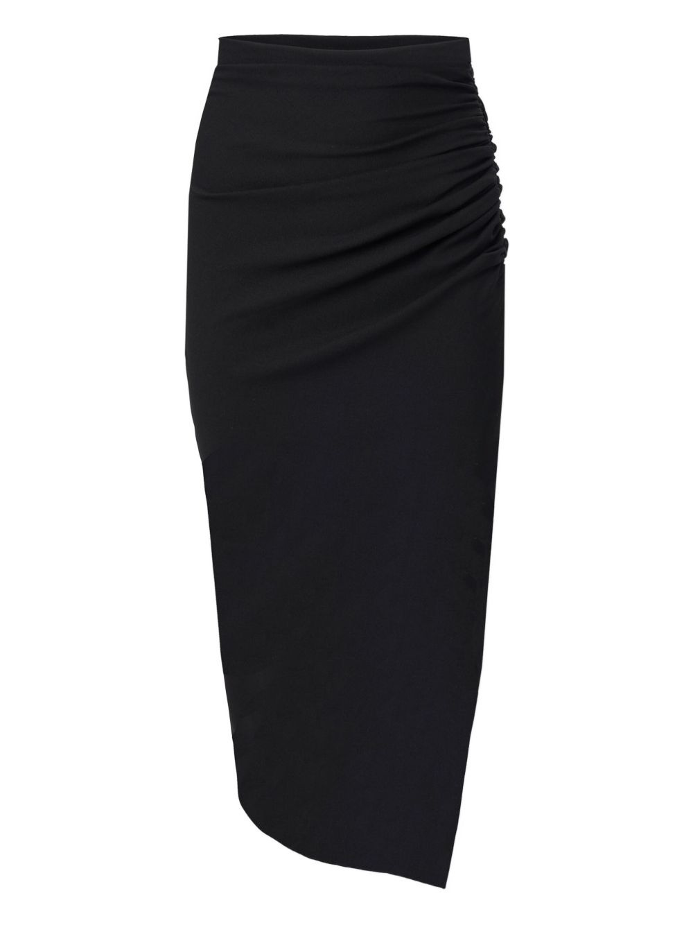 gathered asymmetric skirt Highlights - Black - Asymmetric hem - Gathered detail - Midi length - Wool - Side slit Made in Italy Composition Virgin Wool 97%, Elastane 3% Washing instructions Read Manufacturer Guidelines