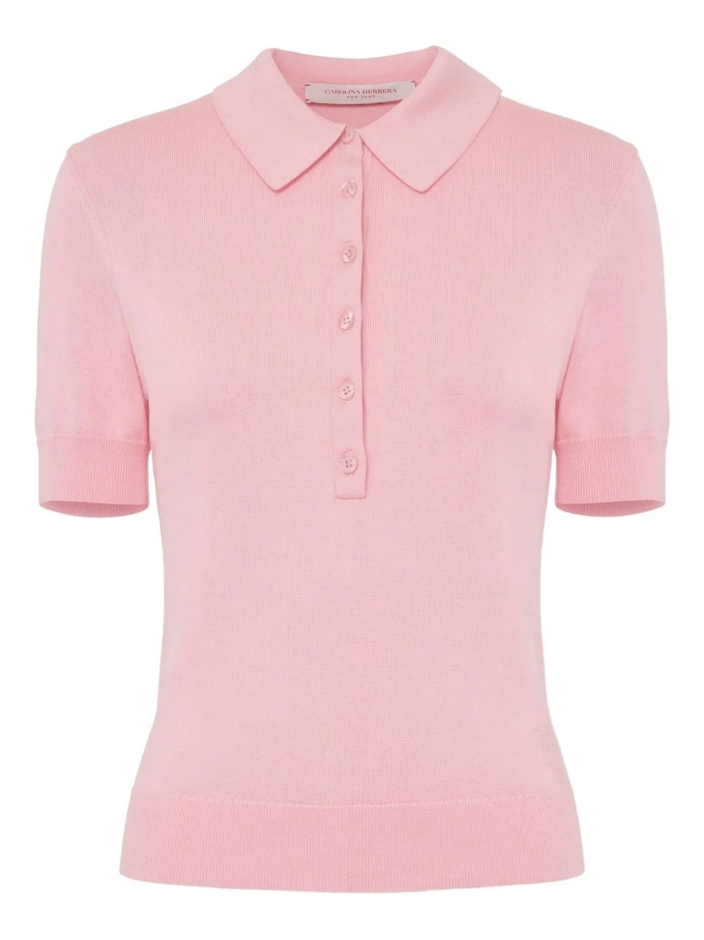 knitted polo shirt Highlights - Blossom pink - Polo collar - Button fastening - Short sleeves - Knit construction Imported Composition Organic Silk 53%, Cotton 44%, Elastane 3%