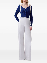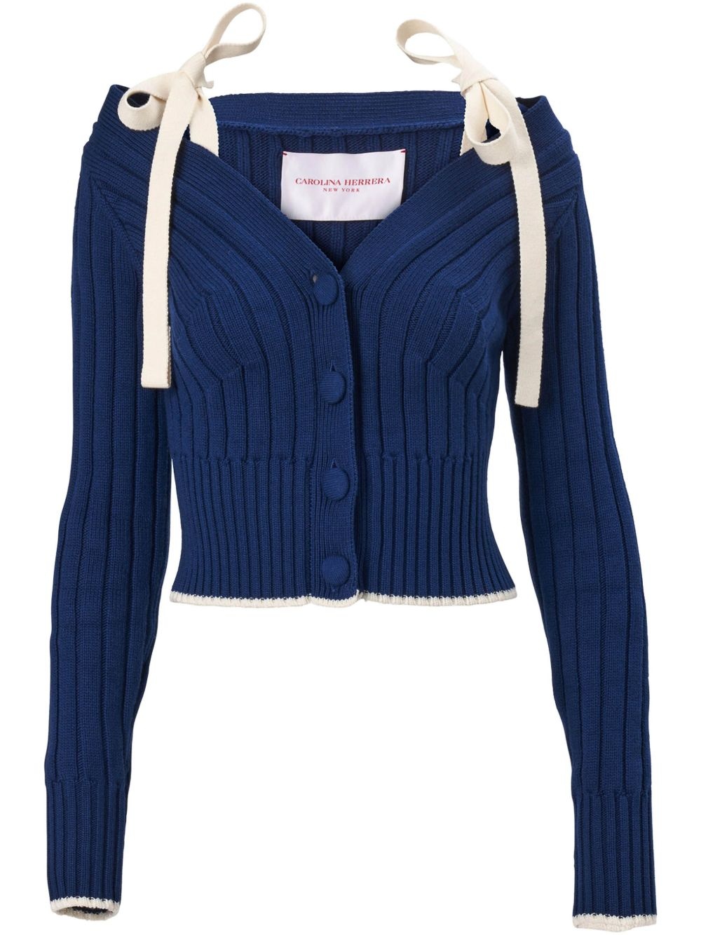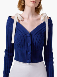 off-shoulder cardigan Highlights - Navy blue - Button fastening - Tie-fastening straps - Long sleeves - Ribbed cuffs and hem Imported Composition Cotton 70%, Virgin Wool 30%