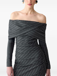 off-shoulder pinstripe asymmetric day dress Highlights - Charcoal grey - Pinstripe pattern - Off-shoulder neckline - Long sleeves - Ruched bodice - Asymmetrical hemline Made in Italy Composition Lambs Wool 46%, Linen/Flax 36%, Recycled Nylon 17%, Elastane 1% Washing instructions Read Manufacturer Guidelines