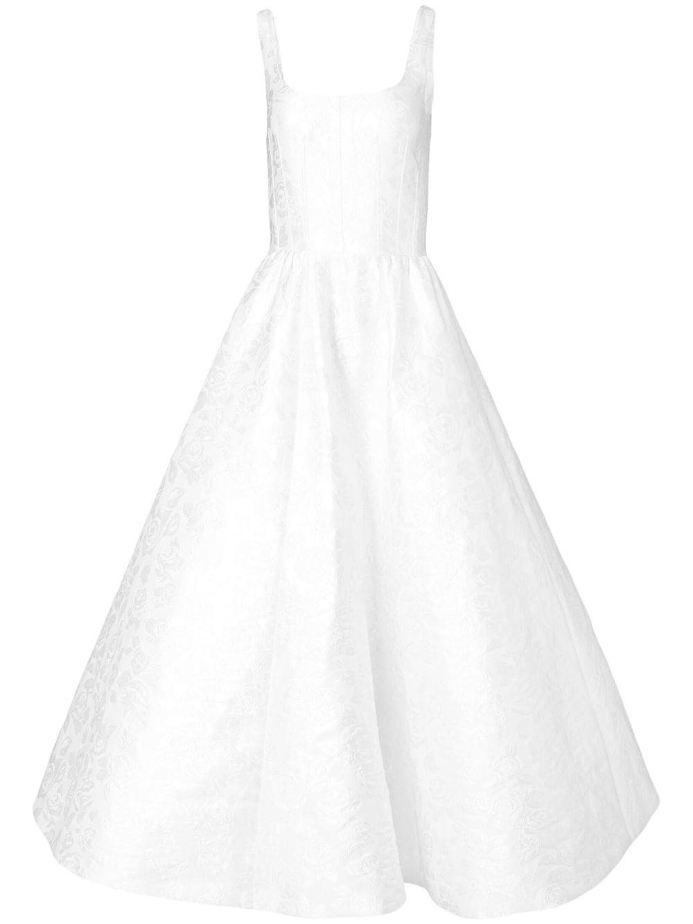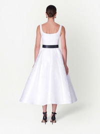 patterned-jacquard midi-dress white patterned jacquard square neck square open back spaghetti straps flared skirt mid-calf length Made in United States Composition Polyester 82%, Polyamide 10%, Metallic Fibre 8% Washing instructions Dry Clean Only