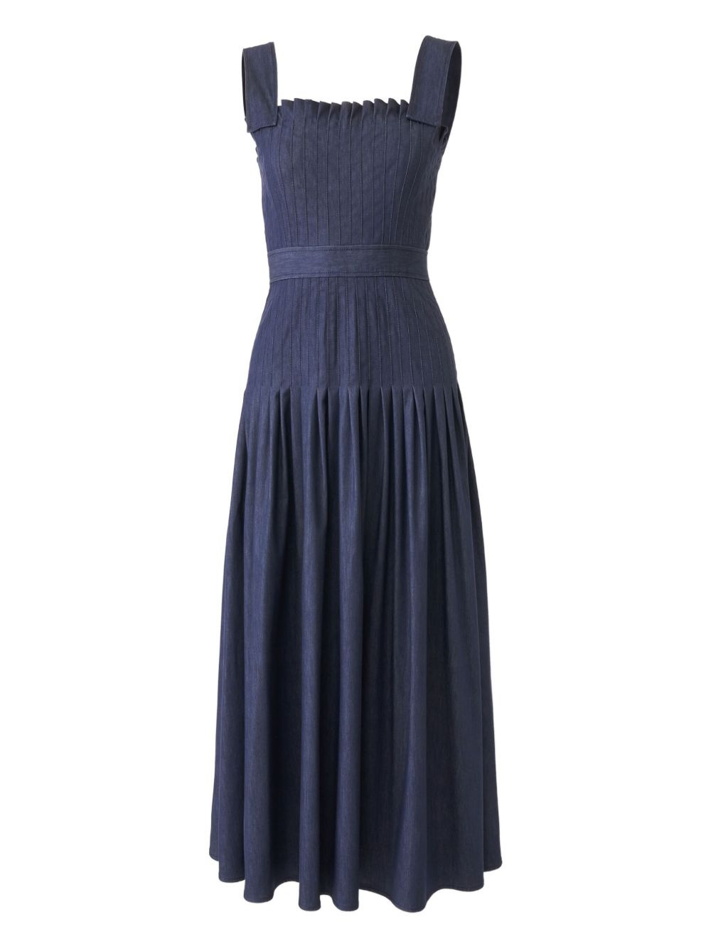 pleated denim midi dress Highlights - Navy blue - Pleated design - Square neck - Fitted waist - Sleeveless - Rear zip fastening Made in United States Composition Cotton 58%, Nylon 38%, Elastane 4% Washing instructions Dry Clean Only