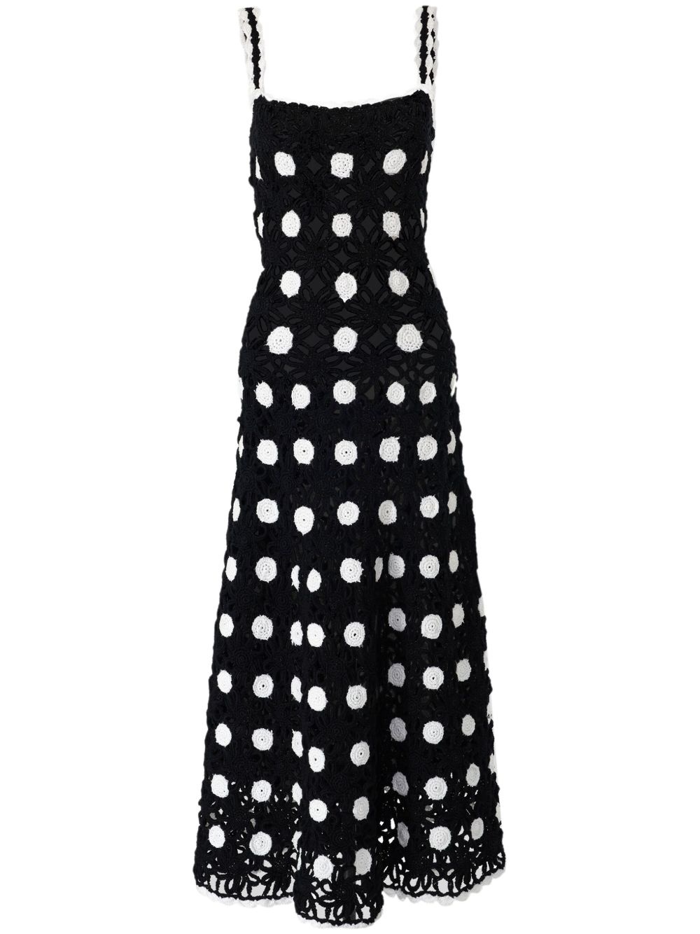 polka-dot knit midi dress Highlights - Black - Scoop neck - Sleeveless - Semi-sheer panels - Scallop edge Made in United States Composition Organic Cotton 100%