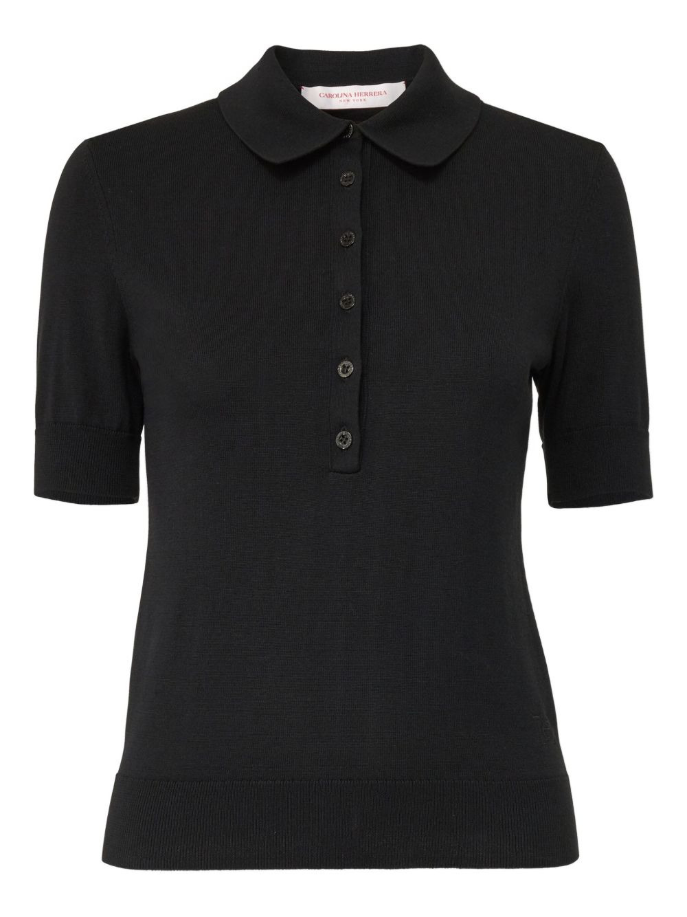 short sleeve polo shirt Highlights - Black - Front button placket - Short sleeves - Straight hem Imported Composition Organic Silk 53%, Cotton 44%, Elastane 3% Washing instructions Dry Clean Only