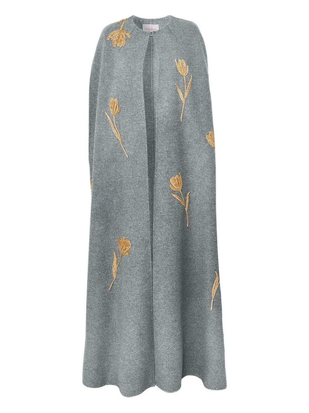 tulip-embroidered cape Highlights - Melange grey - Wool - Tulip embroidery - Long length - Open front - Cape sleeves Made in Italy Composition Virgin Wool 100% Washing instructions Dry Clean Only