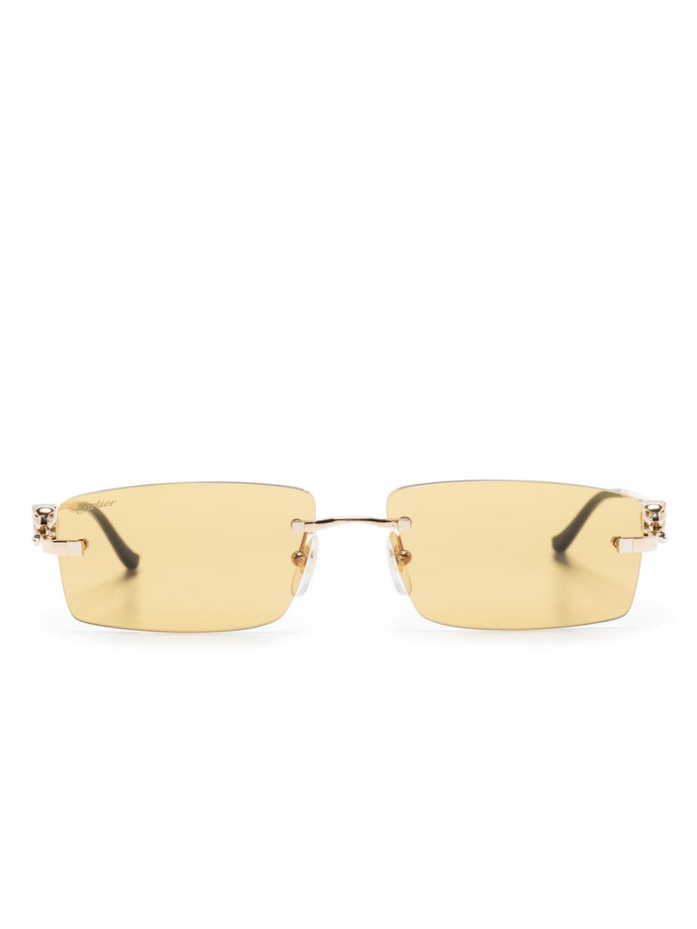 Panther rectangle-frame sunglasses Highlights - Gold-tone - Signature panther plaque - Yellow tinted lenses - Rectangle frame - Rimless lenses - Straight arms - Curved tips - Gold-tone hardware - These glasses come with a protective case. Made in France Composition Acetate 100%, Metal 100% SIZE & FIT Measurement Arm Length 5.51 in(14 cm) Bridge Width 0.59 in(1.5 cm) Lens Diameter 2.28 in(5.8 cm) Total Width 5.51 in(14 cm)
