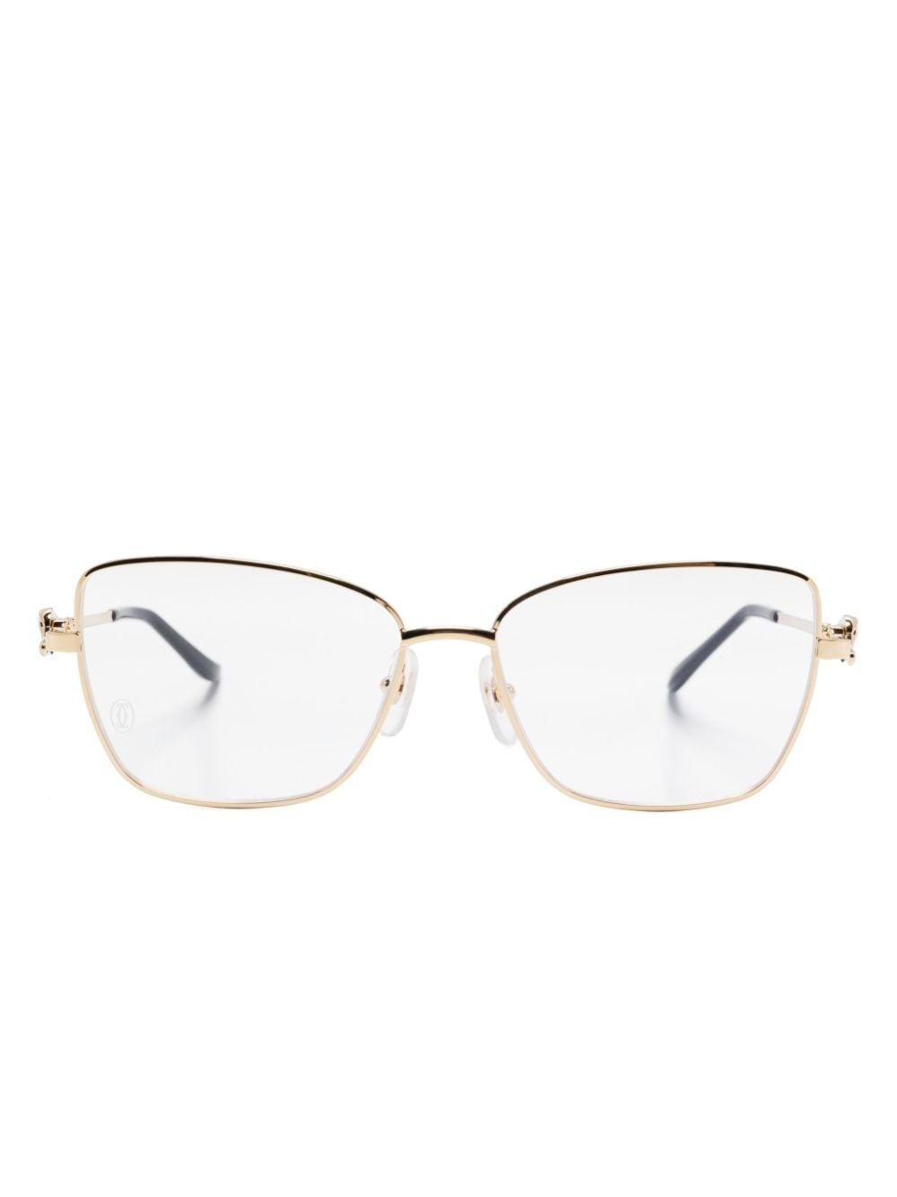 Panthere De Cartier glasses Highlights - Gold-tone - Metal - Cat-eye frame - Clear lenses - Metal brow bar - Signature panther plaque - Sculpted arms - Curved tips - Nose pads - All glasses from farfetch are sold as non-prescription frames. - These glasses come with a protective case. Made in France Composition Metal 100% SIZE & FIT Measurement Arm Length 5.15 in(13.1 cm) Bridge Width 0.59 in(1.5 cm) Lens Diameter 2.16 in(5.5 cm) Total Width 5.39 in(13.7 cm)
