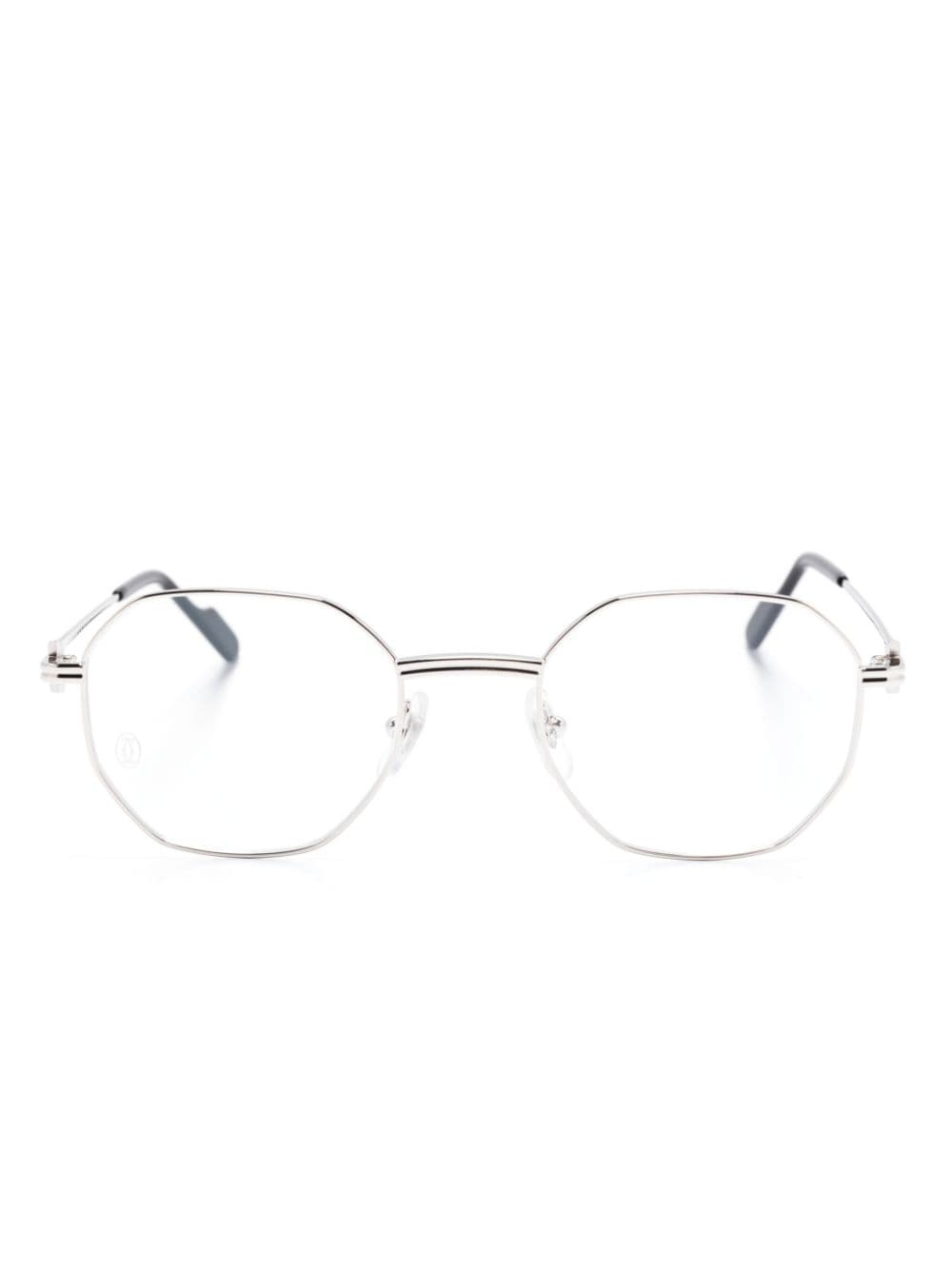 Premiere de Cartier glasses Highlights - Silver-tone - Metal - Metallic finish - C logo plaque - Hexagonal frame - Clear lenses - Lens decal - Straight arms - Logo-engraved curved tips - Nose pads - These glasses come with a protective case. - All glasses from farfetch are sold as non-prescription frames. Made in France Composition Metal 100% SIZE & FIT Measurement Arm Length 5.7 in(14.5 cm) Bridge Width 0.7 in(1.8 cm) Lens Diameter 1.96 in(5 cm) Total Width 5.27 in(13.4 cm)