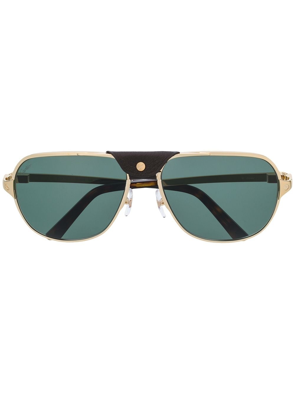 Santos de Cartier sunglasses Gold-tone metal Santos de Cartier sunglasses from Cartier Eyewear featuring aviator frames, tinted lenses, straight arms with angled tips, a brown leather detail and gold-tone screws. This item comes with a protective case. Made in France Composition Metal (Other) 70%, Acetate 20%, Calf Leather 10% SIZE & FIT Measurement Bridge Width 0.62 in(1.6 cm) Lens Diameter 2.36 in(6 cm) Total Width 5.9 in(15 cm) Arm Length 5.31 in(13.5 cm) Washing instructions KERING EYEWEAR