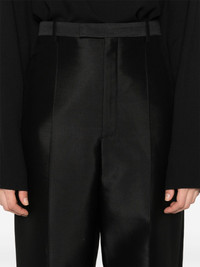 high-waisted trousers Highlights - Black - Hook and zip fly fastening - Belt loops - Two rear welt pockets Imported Composition Outer: Silk 59%, Wool 41% Lining: Cotton 100% SIZE & FIT Model measurements Height 5 ft 10 in(1.78 m) Bust/Chest 33.85 in(86 cm) Hips 36.61 in(93 cm) Waist 26.77 in(68 cm) FittingInformation Designed for a straight-leg fit, these trousers allow for a close fit at the waist and an unrestricted, comfortable fit over the leg Made from a midweight non-stretch fabric Washing instructions Dry Clean Only