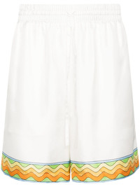 Afro Cubism Tennis Club silk shorts Cut from pure silk, these Casablanca shorts are printed with a logo on the back and a contrasting trim. Highlights - White/multicolour - Silk - Logo print to the rear - Contrasting border - Elasticated drawstring waistband - Straight leg - Two side slit pockets - Rear patch pocket - Straight hem - Above-knee length - When buying this unisex item, keep in mind that it is graded in standard men's sizing. Made in Italy Composition Lining: Polyester 100% Outer: Silk 100% SIZE & FIT Model measurements Height 6 ft 2 in(1.87 m) Bust/Chest 36.41 in(92.5 cm) Hips 35.43 in(90 cm) Waist 29.52 in(75 cm) FittingInformation Designed for relaxed fit, offering a comfortable loose fit over the leg Adjust this piece’s waistband to your preference using the drawstring Made from a lightweight non-stretch fabric This piece fits true to size – take your usual size