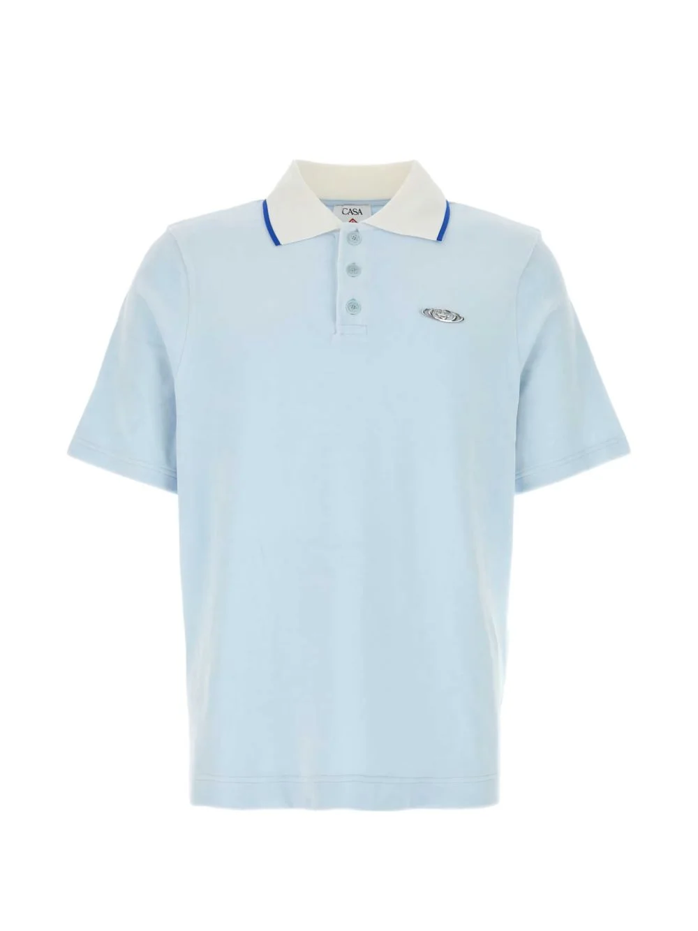 blue polo shirt Highlights - Pale blue - Velvet finish - Button fastening - Contrast collar trim - Short sleeves - Tonal logo motif Imported Composition Cotton 89%, Nylon 11% Washing instructions Read Manufacturer Guidelines