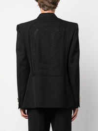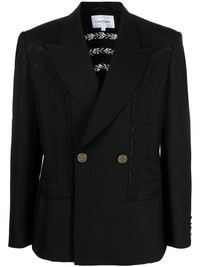 broderie anglaise double-breasted blazer Casablanca puts a characteristically playful spin on a classic blazer for SS23. Crafted from virgin wool, intricate broderie anglaise detailing lends this design a romantic feel, whilst peak lapels and a double-breasted silhouette nod to timeless tailoring. Highlights - Black - Virgin wool - Broderie anglaise - Peak lapels - Double-breasted button fastening - Buttoned cuffs - Long sleeves Made in United Kingdom Composition Outer: Virgin Wool 100% Lining: Viscose 52%, Cotton 48% SIZE & FIT Model measurements Height 6 ft 1 in(1.85 m) Bust/Chest 35.43 in(90 cm) Hips 35.82 in(91 cm) Waist 27.55 in(70 cm) FittingInformation Designed for a boxy fit, intended for a loose fit throughout Made from a midweight non-stretch fabric This piece fits true to size – take your usual size