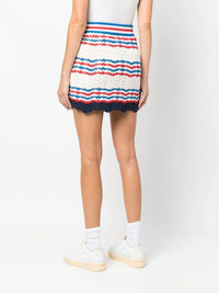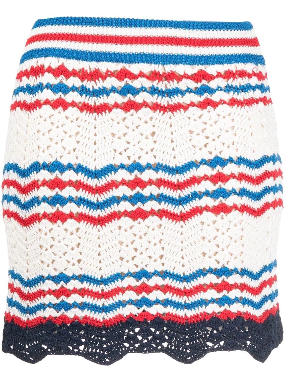 crochet mini skirt white/multicolour cotton crochet knit horizontal stripe pattern high waist elasticated waistband thigh-length Imported Composition Cotton 100% SIZE & FIT Model measurements Height 5 ft 9 in(1.75 m) Bust/Chest 32.67 in(83 cm) Hips 36.22 in(92 cm) Waist 24.8 in(63 cm) FittingInformation This piece fits true to size. We recommend you get your regular size Cut for a close fit Made with a mid-weight fabric Measurement HIPS 32 in(81.3 cm) LENGTH 17 in(43.2 cm) WAIST 24.01 in(61 cm)