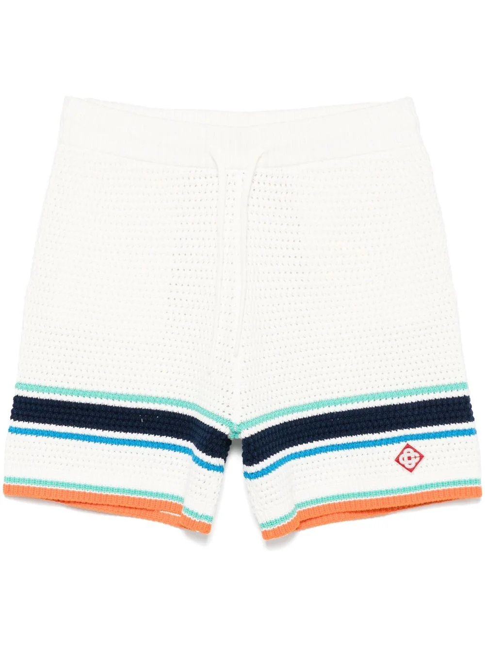 crochet tennis shorts Highlights - White - Elasticated drawstring waistband - Stripe detailing - Embroidered logo to the side Imported Composition Cotton 100%, Viscose 95%, Polyester 5% SIZE & FIT Model measurements Height 6 ft 2 in(1.87 m) Bust/Chest 38.97 in(99 cm) Hips 37.99 in(96.5 cm) Waist 29.52 in(75 cm) FittingInformation Designed for relaxed fit, offering a comfortable loose fit over the leg The elasticated waist allows for a comfortable fit Made from a midweight non-stretch fabric Washing instructions Hand Wash