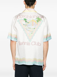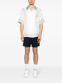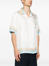 cuban-collar silk shirt Highlights - White/multicolour - Silk - Satin finish - Stripe trim - Logo print at the chest and rear - Graphic print at the chest and rear - Cuban collar - Concealed front button fastening - Short sleeves - Chest patch pocket - Straight hem Made In Italy Composition Silk 100% SIZE & FIT Model measurements Height 6 ft 1 in(1.86 m) Bust/Chest 37.4 in(95 cm) Hips 36.22 in(92 cm) Waist 29.52 in(75 cm) FittingInformation Designed for a regular fit, allowing for a comfortably loose fit throughout the body Made from a lightweight non-stretch fabric This piece fits true to size – take your usual size