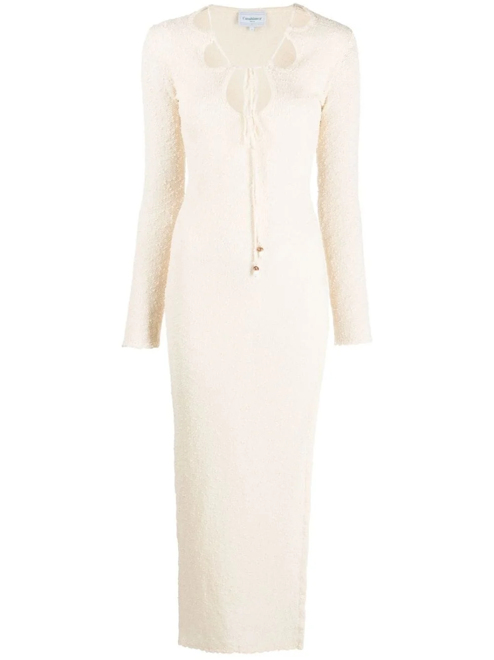 cut-out boucle dress Casablanca’s dress spotlights the brand’s focus on form and texture for SS23. The semi-sheer boucle construction is punctuated by a plunging cut-out U-neck and finished with a thigh-high split. Highlights - Ecru - Boucle construction - Semi-sheer construction - Cut-out detailing - Plunging u-neck - Adjustable neck strap - Long sleeves - Side slit - Calf-length Imported Composition Polyester 100% SIZE & FIT Model measurements Height 5 ft 10 in(1.79 m) Bust/Chest 31.1 in(79 cm) Hips 35.03 in(89 cm) Waist 24.01 in(61 cm) FittingInformation Designed for a close fit throughout Made from a midweight non-stretch fabric, this piece offers minimal elasticity when worn This piece fits true to size – take your usual size