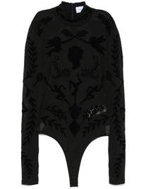 devore-effect bodysuit Highlights - Black - Stretch-design - Devore effect - Concealed rear hook and zip fastening - Concealed press-stud fastening - All-over graphic print - High neck - Long sleeves - Thong style - High cut - Just a reminder that this piece must be tried on over your own garments. Imported Composition Viscose 72%, Polyester 28% SIZE & FIT Model measurements Height 5 ft 9 in(1.75 m) Bust/Chest 31.88 in(81 cm) Hips 34.64 in(88 cm) Waist 24.01 in(61 cm) FittingInformation Designed for a close fit throughout Made from a lightweight fabric