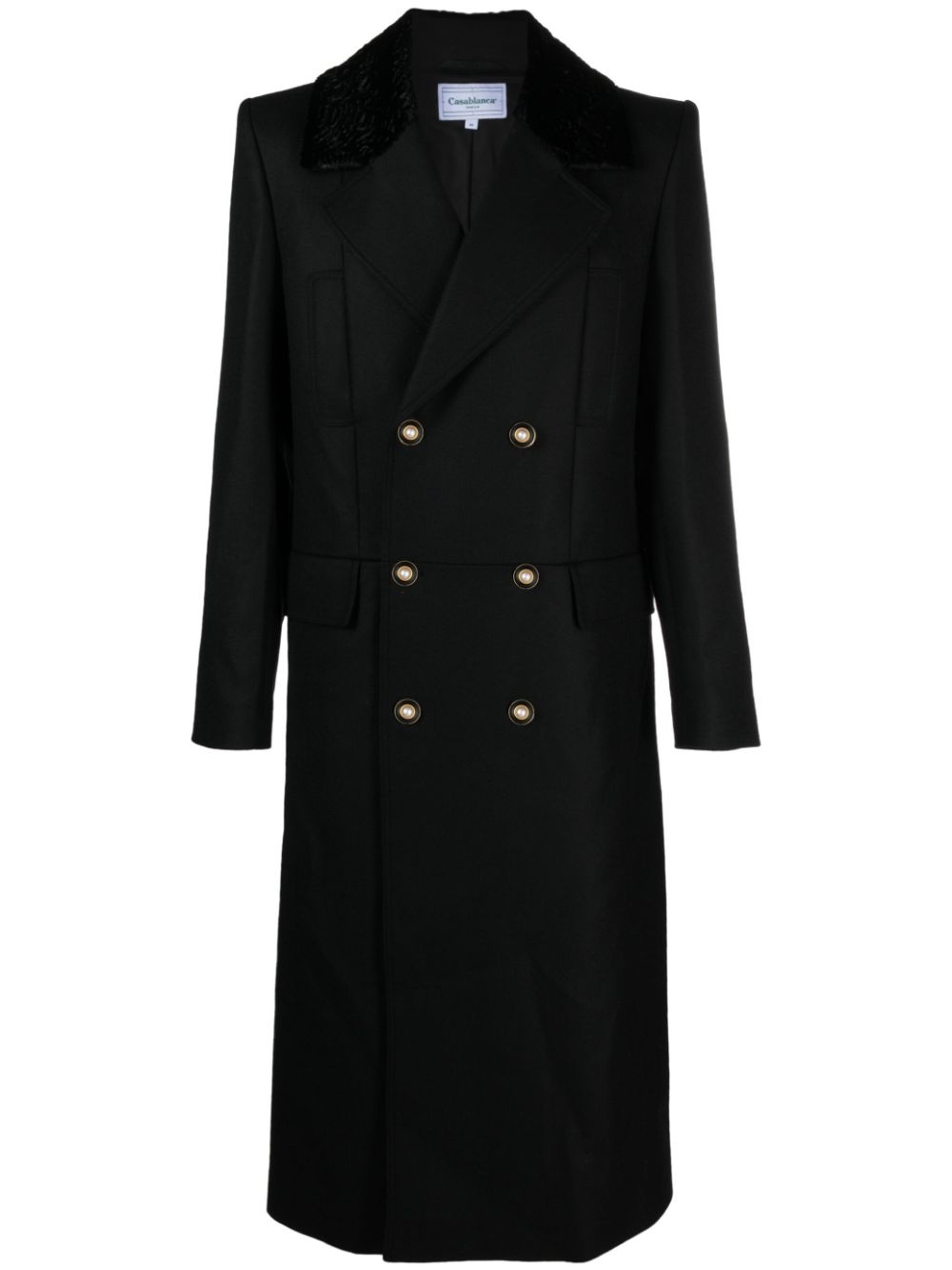 double-breasted wool coat Crafted from a wool blend with a faux-fur trimmed collar, this coat from Casablanca exemplifies refinement. Its classic black tone and double-breasted silhouette add to the sophistication of the piece. Highlights - Black - Wool - Faux-fur trim - Notched lapels - Two chest welt pockets - Double-breasted button fastening - Front flap pockets - Long sleeves - Buttoned cuffs - Straight hem - Mid-calf length Imported Composition Lining: Viscose 52%, Cotton 48% Outer: Wool 100%, Acetate 67%, Polyester 21%, Polyamide 12% SIZE & FIT Model measurements Height 6 ft 2 in(1.89 m) Bust/Chest 35.03 in(89 cm) Hips 38.18 in(97 cm) Waist 29.92 in(76 cm) FittingInformation Designed for a slim fit, offering a comfortable fit that sits just away from the body Made from a midweight non-stretch fabric, this piece offers minimal elasticity when worn This piece fits true to size – take your usual size