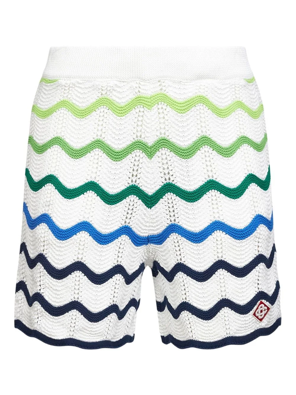 elasticated scalloped knit shorts Highlights - White - Gradient wave knit pattern - Open weave crochet design - Elasticated waistband - Logo patch - Scalloped edges Imported Composition Cotton 100% Washing instructions Read Manufacturer Guidelines