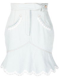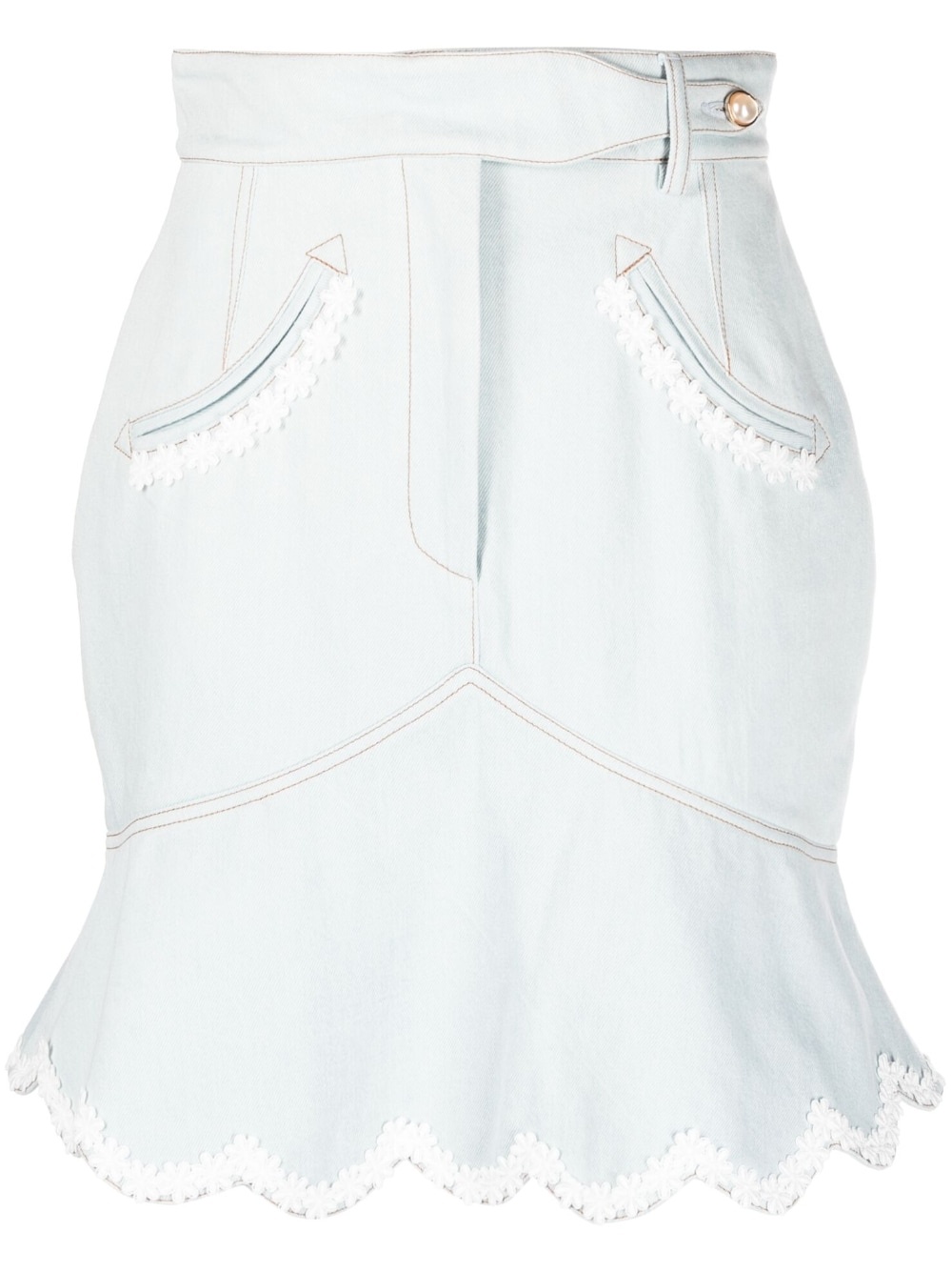 floral-embroidered denim peplum skirt This floral-embroidered light blue denim skirt by Casablanca radiates elegant appeal with its delicate scalloped hem. Curved front pockets echo its meandering peplum silhouette, showcasing the relaxed attitude of the brand. Highlights - Light blue - Cotton - Denim - Floral detail - High waist - Front button fastening - Concealed front zip fastening - Curved front pockets - Logo patch to the rear - Peplum hem - Scallop hem - Above-knee length Imported Composition Cotton 100%, Leather 100% SIZE & FIT Model measurements Height 5 ft 10 in(1.78 m) Bust/Chest 29.92 in(76 cm) Hips 34.64 in(88 cm) Waist 23.62 in(60 cm) FittingInformation Designed for a slim fit that sits just away from the body offering a close yet comfortable fit Sturdy and hard-wearing, this denim piece offers no stretch This piece fits true to size – take your usual size Washing instructions Machine Wash