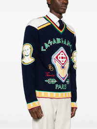 Fraternity sweater Highlights - Navy blue/multicolour - Merino wool - Knitted construction - Striped ribbed trim - V-neck - Logo patches to the front - Stripe detailing - Drop shoulder - Long sleeves - Elbow patches - Straight hem Imported Composition Polyester 100%, Merino 100% SIZE & FIT Model measurements Height 6 ft 2 in(1.87 m) Bust/Chest 35.03 in(89 cm) Hips 34.64 in(88 cm) Waist 25.98 in(66 cm) FittingInformation Designed for a relaxed fit, this piece allows for comfort and movement when worn Made with a midweight knit, this piece offers some stretch Washing instructions Dry Clean Only