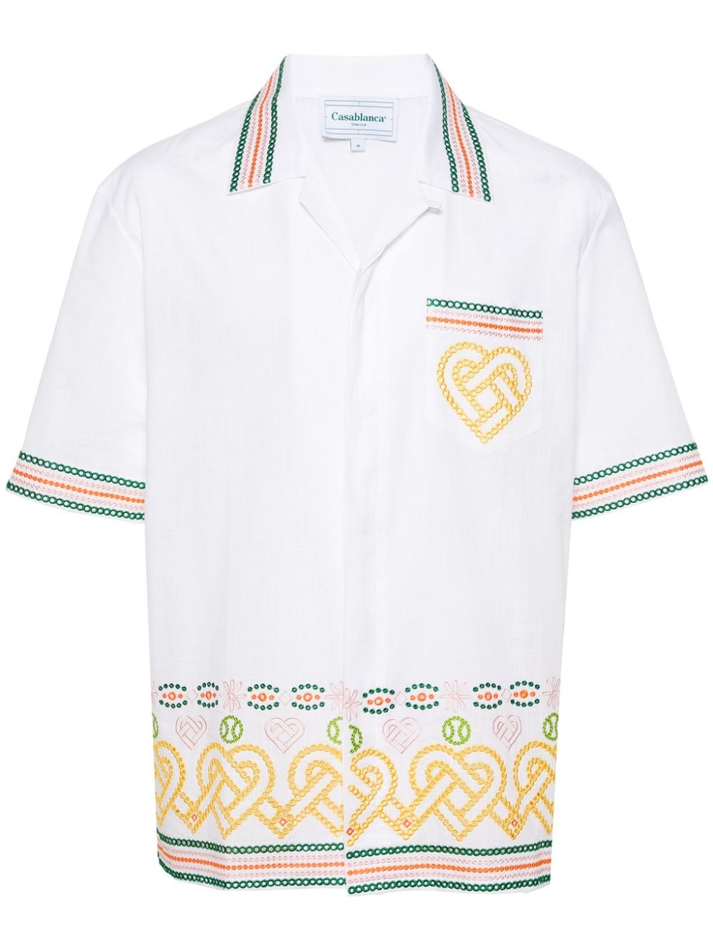 Gradient Heat broderie-anglaise shirt This shirt is emblazoned with Casablanca's Gradient Heat motif in a broderie anglaise technique. Multicoloured threads run across the edges to stand out against the white cotton background. Highlights - White/multicolour - Cotton - Lightweight construction - Broderie anglaise - Circle motif - Camp collar - Short sleeves - Chest patch pocket - Heart motif - Straight hem Made in Italy Composition Viscose 100%, Cotton 100% SIZE & FIT Model measurements Height 6 ft 2 in(1.87 m) Bust/Chest 37.79 in(96 cm) Hips 37.79 in(96 cm) Waist 30.31 in(77 cm) FittingInformation Designed for a relaxed fit, this piece allows for comfort and movement when worn Made from a lightweight non-stretch fabric This piece fits true to size – take your usual size Measurement CHEST 43.3 in(110 cm) SLEEVE LENGTH 10.98 in(27.9 cm) LENGTH 27.51 in(69.9 cm) WAIST 42.99 in(109.2 cm) Shoulder Width 19.48 in(49.5 cm) Washing instructions Machine Wash