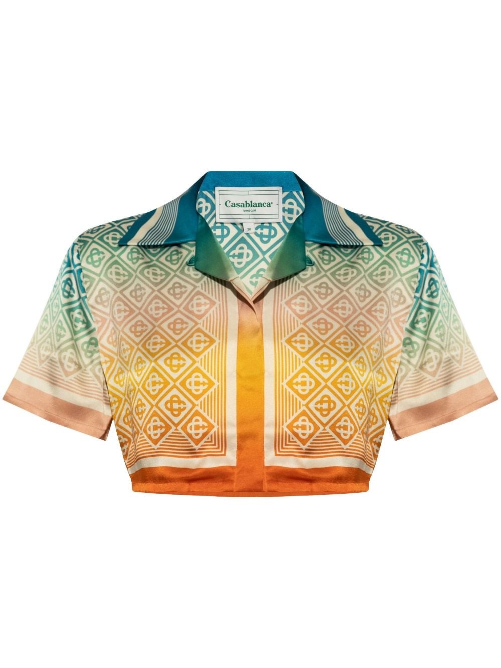 Gradient Monogram silk cropped top Highlights - Multicolour - Silk - Twill weave - Gradient effect - Monogram print - Heart motif - Stripe trim - Cuban collar - Concealed front button fastening - Short sleeves - Straight hem Made in Italy Composition Silk 100%