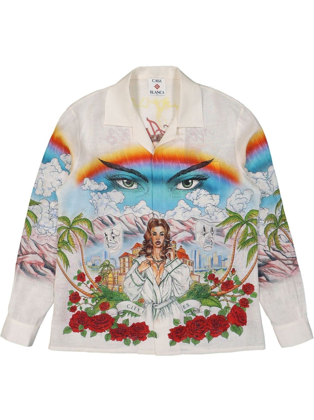 graphic-print shirt Highlights - White - Concealed front fastening - Cuban collar - Long sleeves - Buttoned-cuff sleeves Made in Italy Composition Linen/Flax 100% SIZE & FIT Measurement CHEST 44.88 in(114 cm) SLEEVE LENGTH 35.03 in(89 cm) LENGTH 29.52 in(75 cm) Shoulder Width 18.89 in(48 cm) FittingInformation This unisex piece is designed for a loose fit whether you usually select women's or men's sizes Made from a lightweight non-stretch fabric