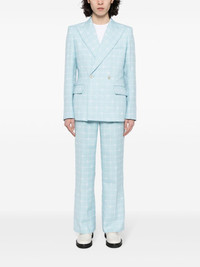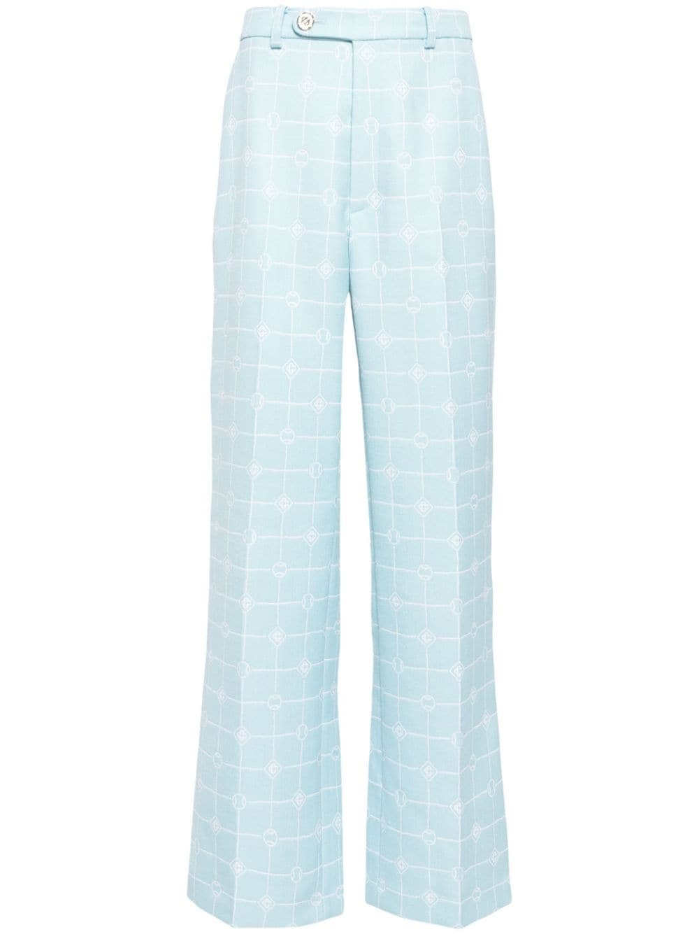 Heart Monogram-jacquard wool trousers Spun from midweight wool for a structured tailored-inspired look, these light blue trousers are punctuated with Casablanca's Heart Monogram throughout. They sit high at the waist from where they fall to a straight silhouette. Highlights - Light blue/white - Wool - Monogram jacquard - High-waisted - Belt loops - Concealed fly and button fastening - Two side slit pockets - Two rear welt pockets - Straight leg Imported Composition Outer: Wool 99%, Polyester 1% Lining: Viscose 52%, Cotton 48% SIZE & FIT Model measurements Height 6 ft 2 in(1.87 m) Bust/Chest 33.07 in(84 cm) Hips 35.43 in(90 cm) Waist 26.77 in(68 cm) FittingInformation Designed for a straight-leg, allowing for an unrestricted and comfortable fit over the leg Made from a midweight non-stretch fabric This piece fits true to size – take your usual size Washing instructions Dry Clean Only