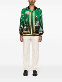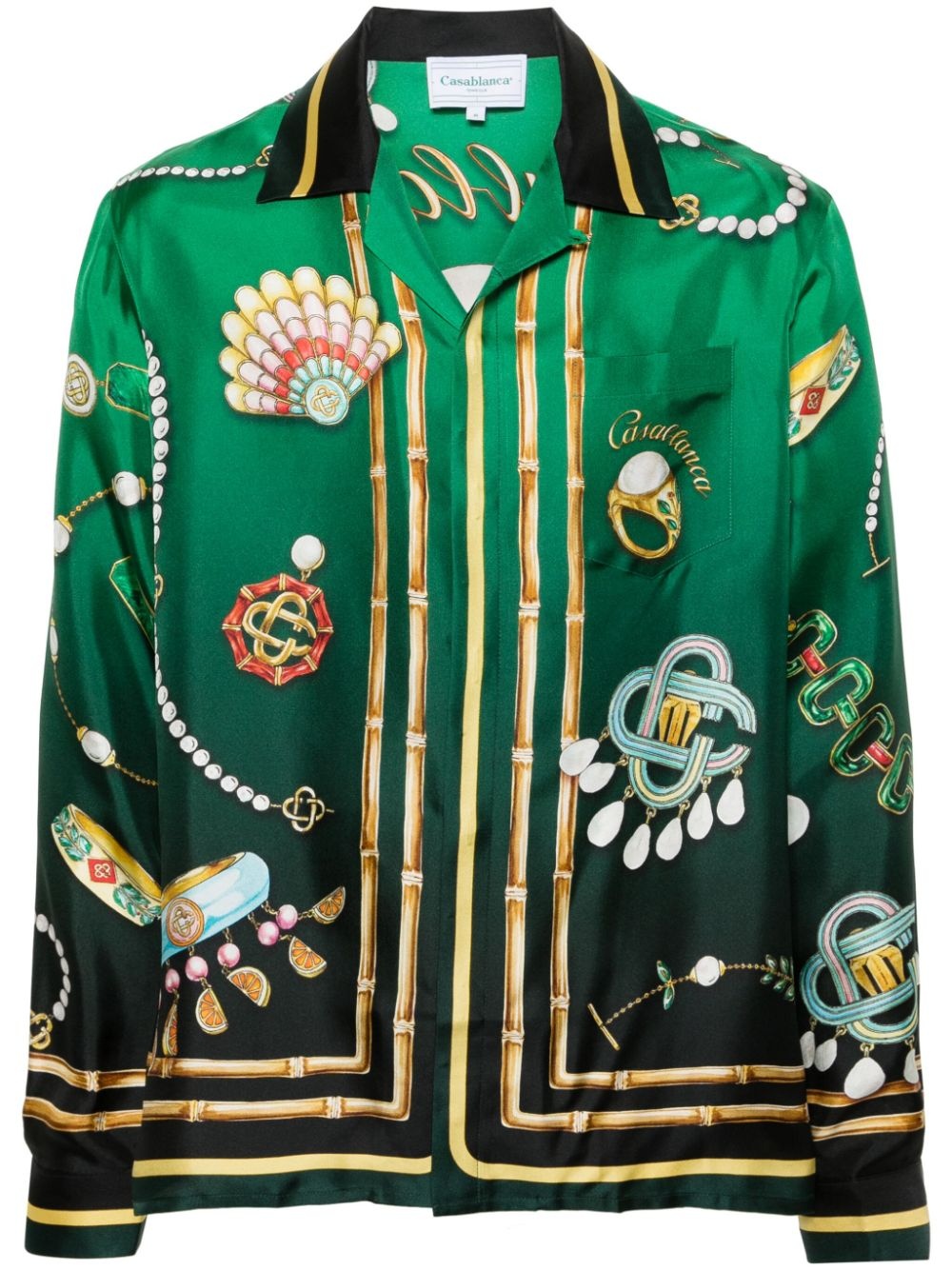 La Boite A Bijoux silk shirt Fluid shirting is at the core of Casablanca’s design DNA, and it acts as a perfect platform to unravel the story behind its collections. The illustrative graphic on this silk-made design displays the brand’s vibrancy: it merges jewellery pieces with logo lettering and emblems. Highlights - Green - Multicolour - Silk - Satin weave - All-over graphic print - Logo print at the chest - Logo print to the rear - Camp collar - Concealed front button fastening - Long sleeves - Buttoned cuffs - Chest patch pocket Made In Italy Composition Silk 100% SIZE & FIT Model measurements Height 6 ft 2 in(1.87 m) Bust/Chest 36.22 in(92 cm) Hips 37 in(94 cm) Waist 27.95 in(71 cm) FittingInformation Designed for a regular fit, allowing for a comfortably loose fit throughout the body Made from a lightweight non-stretch fabric This piece fits true to size – take your usual size Measurement CHEST 45.66 in(116 cm) SLEEVE LENGTH 35.82 in(91 cm) LENGTH 28.74 in(73 cm)