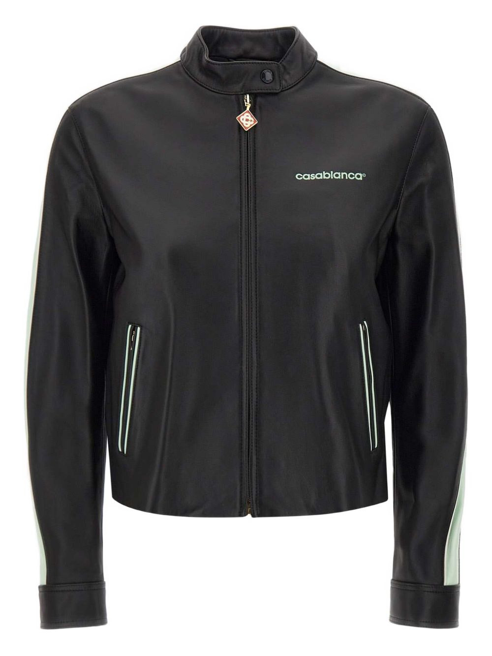 leather racer jacket Highlights - Black - Lambskin - Full zip fastening - Stand-up collar - Contrasting panel detail - Zip pockets Imported Composition Lamb Skin 100% Washing instructions Read Manufacturer Guidelines